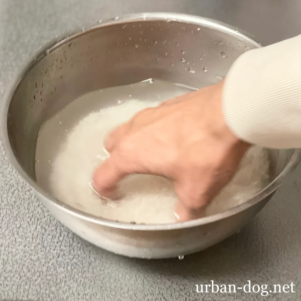 2回目以降、軽く手で洗いこれを5~6回繰り返し、ある程度水が澄んできたら終了。